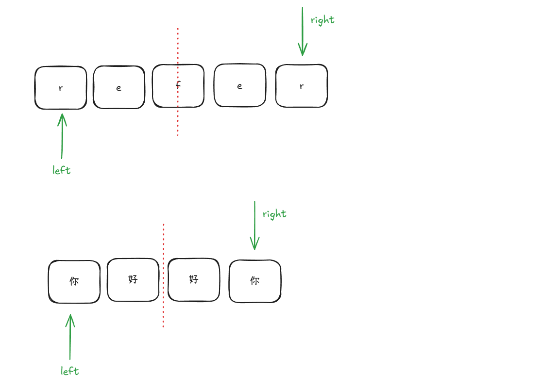 字符串长度的奇偶变化是否存在影响?当为偶数长度,那么左右指针不会重叠,会在相临时结束(不影响);当为奇数长度,(最后一次)取的字符为中心字符两侧的字符,不影响。