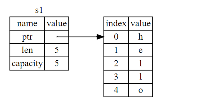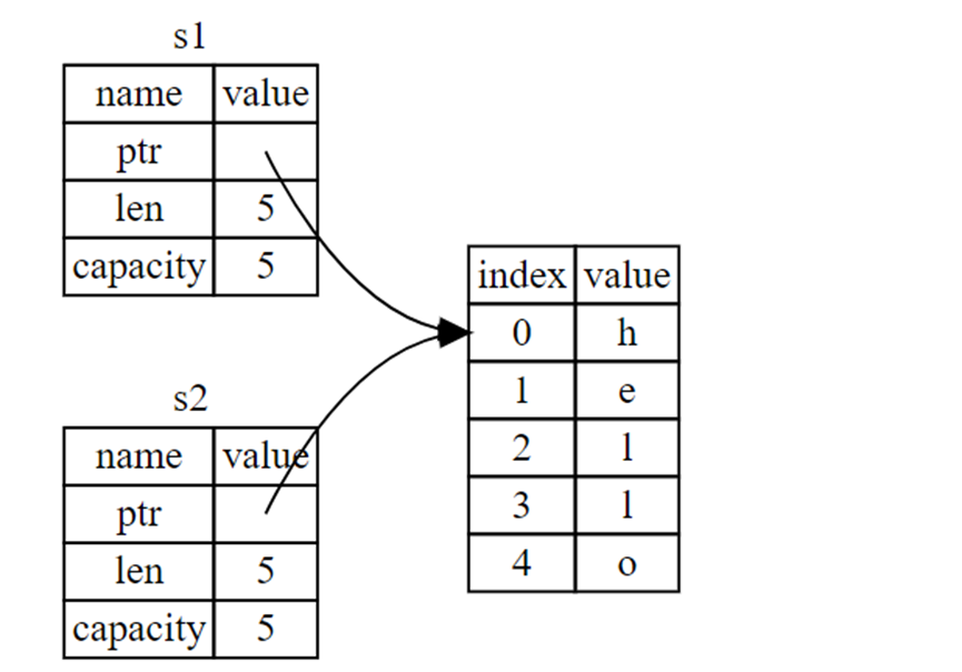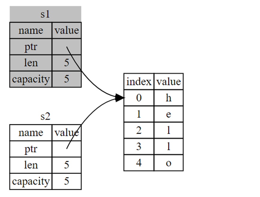 When we assign s1 to s2, the String data is copied, meaning we copy the pointer, the length, and the capacity that are on the stack. We do not copy the data on the heap that the pointer refers to. In other words, the data representation in memory looks like this: